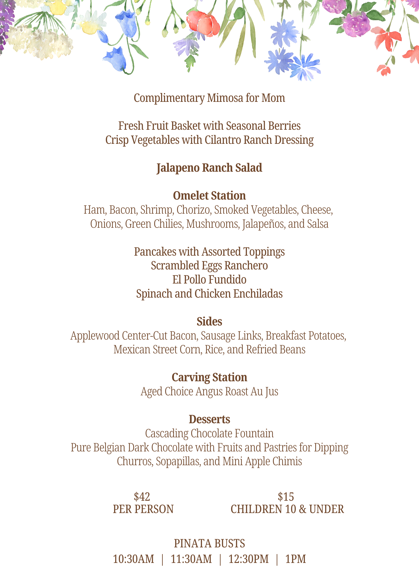 Come celebrate Mom with the Aunt Chilada’s Family! Mother's Day brunch is back for 2025 and we're so excited to have everyone in! See the menu below for our brunch options, served 10 AM - 2 PM. There will also be a cascading chocolate fountain out for everyone to enjoy & Piñata busts for the kids!
